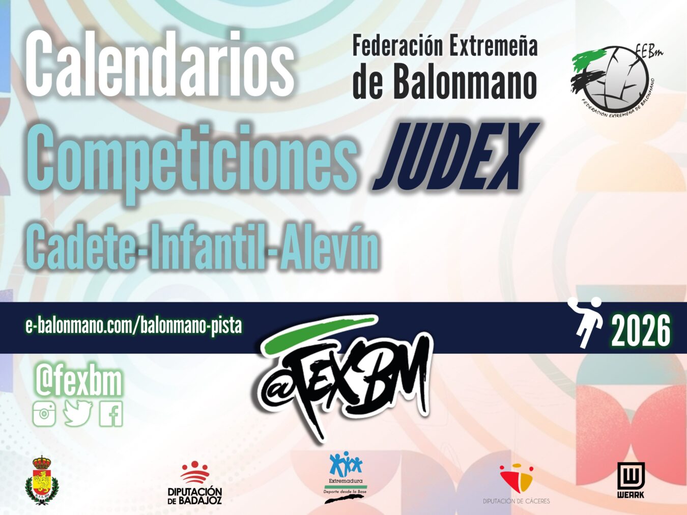 Ya disponible para su descarga el Calendario de Competición de las Concentraciones Cadete, Infantil y Alevín Femenino y Masculino JUDEX 2026: Concentraciones JUDEX Femeninas 2026 Concentraciones JUDEX Masculinas 2026 Todas las Concentraciones se disputarán en la Ciudad Deportiva de Mérida (3 pistas) en horario de mañana y tarde. En la semana de cada una de